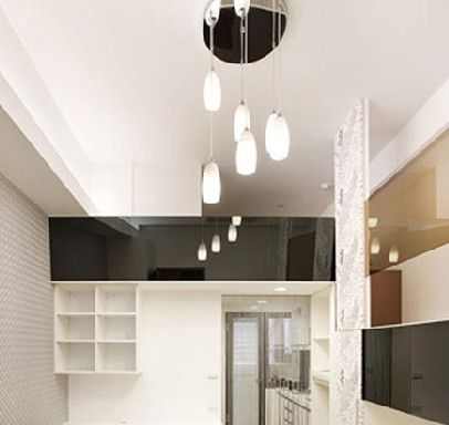 1、客厅是个挑高的空间,并且利用吊灯来增加空间变化感。厨房空间用线廉区隔开,使空间显得不会太狭隘,更能引导室外的光源