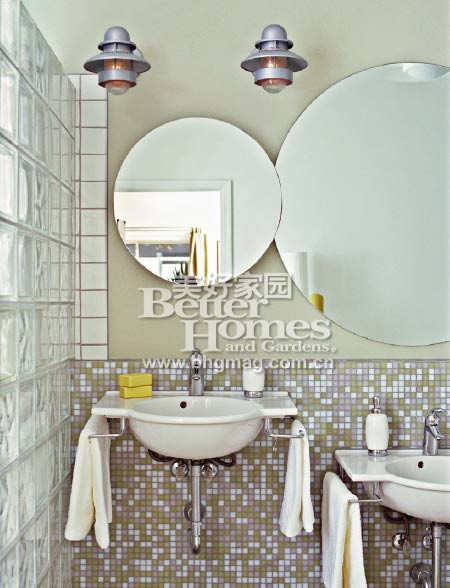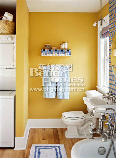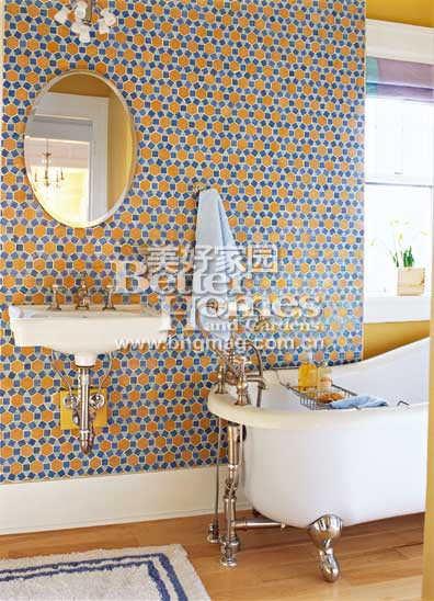 闪耀的马赛克使本来乏味的浴室变得明亮起来,拼成20世纪流行的六边形图案,使房间充满了怀旧的异域色彩。这种跳跃的颜色体现在浴室的墙壁、地面、装饰品上。搭配柔和的南瓜颜色的墙壁让人感觉温暖、有趣。相近的地板颜色使房间更加温暖舒适。