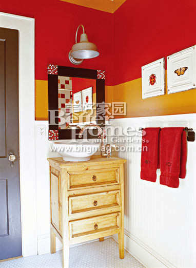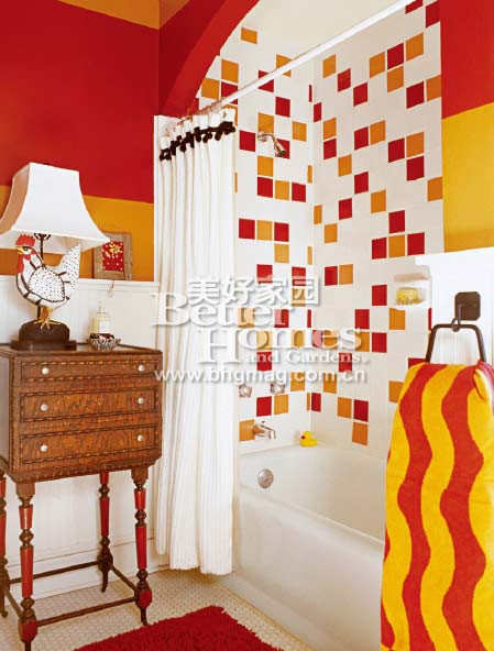 鲜艳的红色和橙色瓷砖给浴室一种摩登艺术的感觉。为了让效果更明显,主人还配合着瓷砖的颜色在墙壁上涂了红色和橙色的油漆,以及天花板上浅橙色的底色。