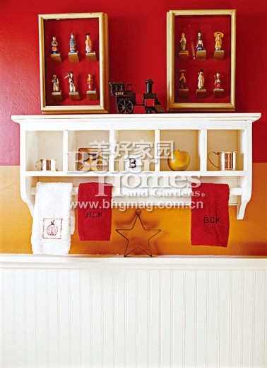 墙壁的底层涂上了白色的油漆,使多彩的房间颜色有了平衡。地面是白色的多边形瓷砖。一个红酒柜改造的储物柜,不仅能储物还巧妙地遮盖了水管。活泼的壁灯,精致的配件,鲜艳的色彩,使浴室成为了家里最舒适的空间。