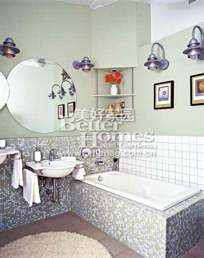 马赛克装饰成为了整个空间的焦点,只在一面墙壁上安装马赛克,不但节省了费用,也使马赛克成为了装饰空间的艺术品。因为浴室很小,如果给每面墙壁都安上彩色马赛克或瓷砖,会使空间看起来更拥挤,用这样的装饰不但使它们成为房间巧妙的装饰品,也点缀了浴缸的背景。