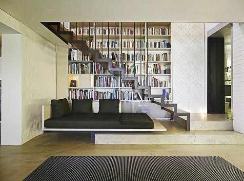 摩洛哥的扶手当然好看,可是,除了好看,我们在生活里需要的似乎还有很多。不规则的书架让楼梯多了几分灵活的性格,同时白色也增大了空间感。当你上楼下楼的时候,随手拿起一本书,就在楼梯上坐下来读一读,这种随性的感觉,难道不也是惬意?