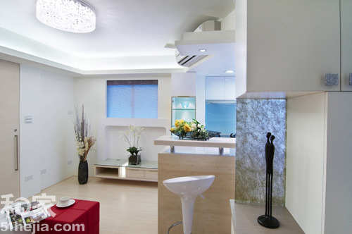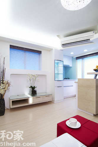 电视主墙上方刻意留下的腰窗,保持了空间的明亮敞朗,简单的栓木洗白线条节约出了实用地生活动线。