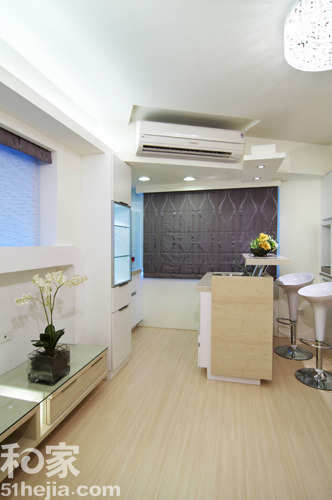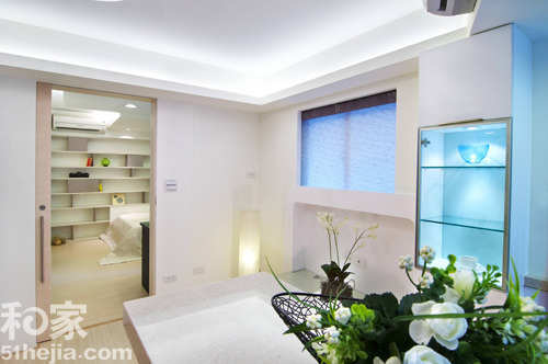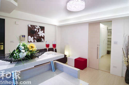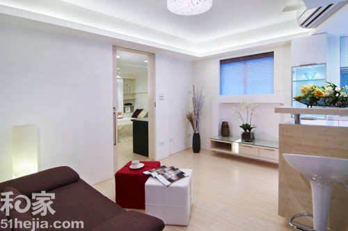 客厅望向主卧,一房一厅的动线流畅,通往主卧门片改以推拉门设计,回避了转圜时的不必要碰撞。