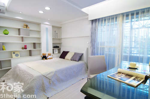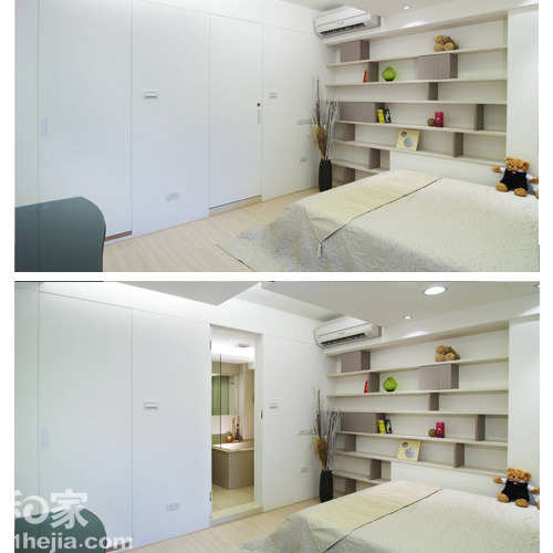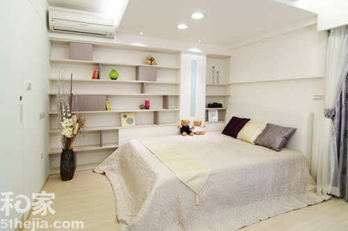 主卧展示与收纳,顺势而下烤漆玻璃虚化了床边柱体存在,立面处做入大量展示层板,并跳以秋香木柜体,让收纳有了更多趣味