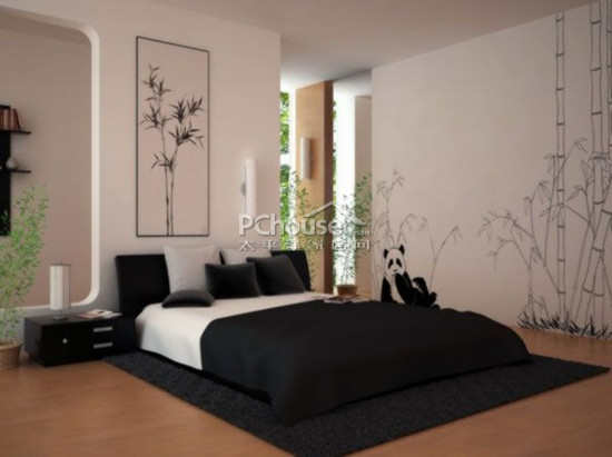 户主似乎是个热爱国宝的人呢。空间以黑白为主,墙上挂了竹子图,还用手绘方式丰富了墙面,充满童趣。绿色植物点缀其中,使空间更富生机。