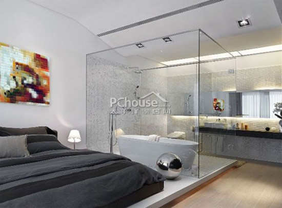 空间的亮点是透明的浴室。去掉墙壁的束缚,可以一览卧室的风景。户主下班后可以在这里好好享受一下一个人的悠闲生活。