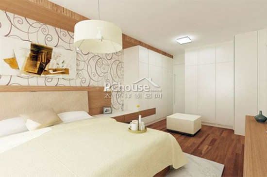 宽大的双人床占据卧室大部分空间,可见户主更注重睡眠的质量。木质地板的元素延伸到了墙上,而卧室颜色基本上为白色和浅棕色,空间更具整体性。