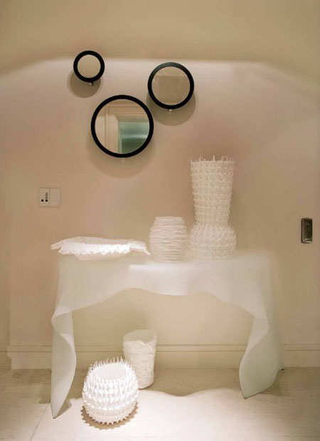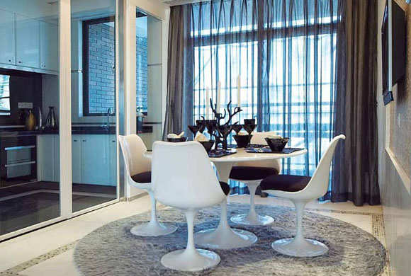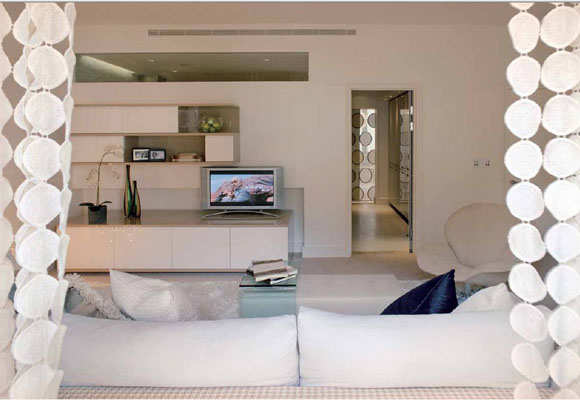 【太平洋家居网 设计频道】公共区域以“白”为基调,结合动态曲线、体积特点和非同寻常的几何因素来展现,从而创造了一个纯净的梦幻空间;然而主卧室穿插着由多个自由体有序的组合在一起的几何图案,跟整个空间形成强烈的反差,满足了另一种个性化追求,让整个空间简而不简单。