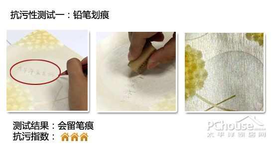 结果分析:用铅笔在壁纸上写“太平洋家居网”字样,再用橡皮擦去除文字。经评测员反复擦,铅笔污迹是消除了,但壁纸上还是能清晰的看到“太平洋家居网”的笔痕。