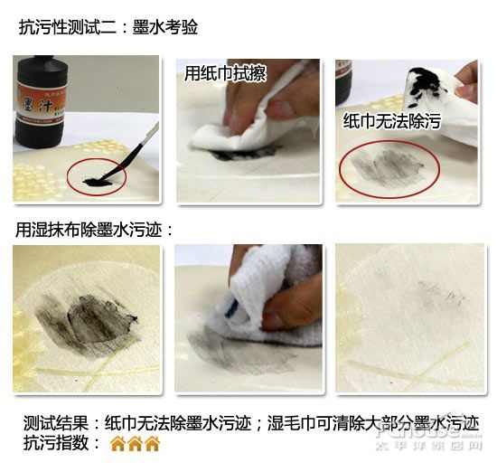 评测方法:用铅笔在壁纸上写字,再用橡皮擦进行除污;把墨水滴于壁纸上,用纸巾拭擦,如果纸巾无法除污,再用湿毛巾拭擦。