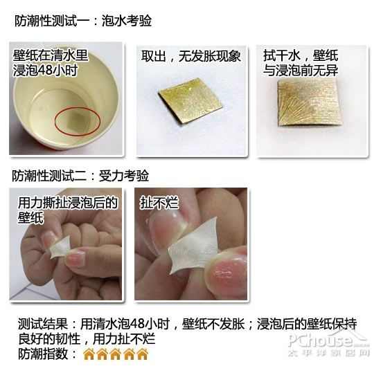 测试方法:把壁纸剪成小块,放于清水中泡48小时。再从水中取出壁纸,看其是否吸水后发胀变形、褪色;再看浸泡后的壁纸是否易撕裂。