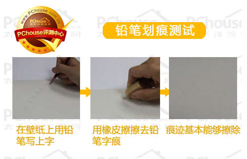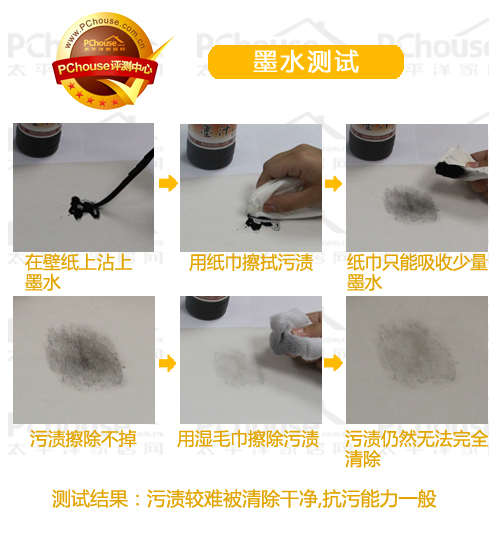 测试结果:评测员在壁纸上用铅笔涂画后用橡皮擦擦拭,笔迹基本能够擦除干净;但沾上墨汁后的表现不如人意,尽管已用湿毛巾一再擦拭,但壁纸上的墨汁污渍仍有残余,抗污性能表现一般。