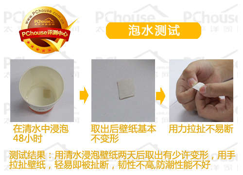 测试方法:把壁纸剪成小块,放于清水中泡48小时。再从水中取出壁纸,看其是否吸水后发胀变形、褪色;再看浸泡后的壁纸是否易撕裂。