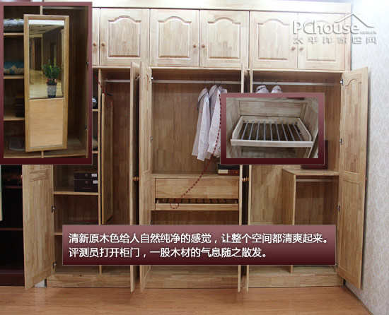 清新原木色给人自然纯净的感觉,把这样一个衣柜放置在卧室,让整个空间都清爽自然。评测员打开柜门,一股木材的气息随之散发。这款是定制衣柜,大小尺寸可根据消费者空间的大小进行量身定造。