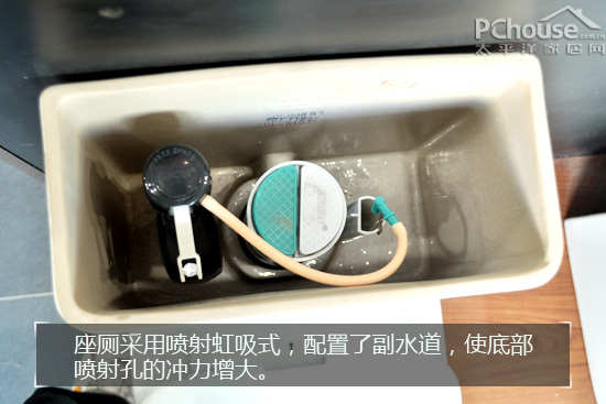 在冲洗功能上,座厕采用喷射虹吸式,配置了副水道,使底部喷射孔的冲力增大,在排污试验中,将实验物冲出后平行输送18米,而国家标准为12米。