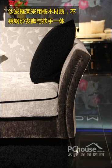 沙发的框架采用了桉木实木框架,桉木质量较轻,做出来的家具不会特别沉,方便搬运。但有不够坚韧的缺点。这款沙发的扶手和沙发脚是其中的一个设计亮点。一条带弧度的不锈钢条从沙发扶手连接到沙发脚。更加牢固而且更加具有现代感和时尚感。