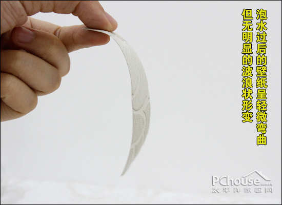 我们采用24小时清水浸透对壁纸做一个防潮性测试,检测此款壁纸是否有着良好的防潮性能。而以24小时浸透过后的壁纸,我们发现此款壁纸产生了相对较低的受潮弯曲幅度。