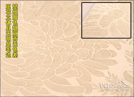 壁纸表面无印染杂质,色泽整体细腻柔和,无明显的色差现象。表面的压花工艺细腻且清晰,抚摸无明显起毛与印花脱落的现象。压花图案以一层金属光泽的颜料作底色,装点一层纹路清晰一致的立体压花,使壁纸无论在视觉上还是表面质感上都具有一种非常强烈的立体冲击。