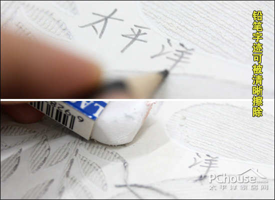 居家生活当中,墙壁的污渍产生可谓是无法避免的一件事。我们以不同性质的笔迹涂鸦对壁纸的耐污性做一个简析的耐污性测试。以铅笔为例,在壁纸写字后以橡皮擦除,壁纸上的铅笔字迹可被明显擦干净。