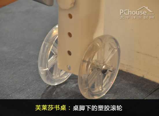 在方便书桌位置移动的设计上,在后方的两个桌脚设置了两个双环的移动滚轮,而前方两个桌脚并没有设置滚轮,主要是为了让书桌能保持一定的稳定性。在双层的移动滚轮设计上,采用了塑胶作为滚轮的材质,一方面可以防止移动对家庭地板的刮损,另一方面,良好的弹力可紧贴地面,保持书桌稳定。