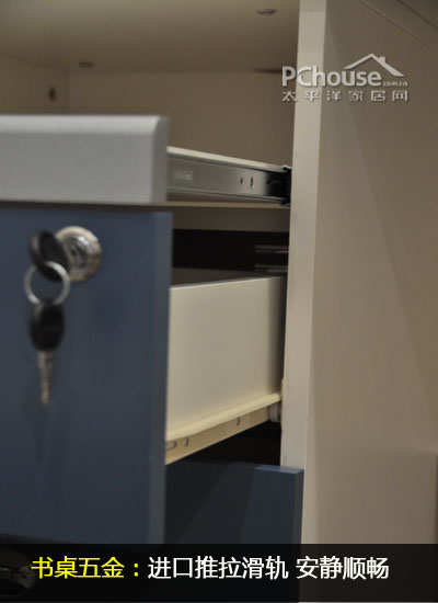 我爱我家这款组合书桌FG20抽屉的推拉滑轨采用进口五金件,评测员现场试用,抽屉拉开不费力,而且安静顺畅,没有噪音。抽屉的稳固性是许多家长关心的问题,评测员用力按下抽屉,比较稳固,儿童使用时可以承受。