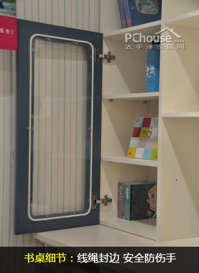 我爱我家这款组合书桌FG20考虑儿童使用安全性,书桌的玻璃柜门里面采用线绳封边,可以有效的防止玻璃伤手,但是如果是淘气的孩子把线绳抠出来就很危险了。