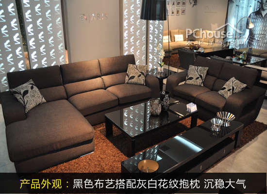 爱依瑞斯这款沙发采用黑色布艺整体颜色搭配灰白花纹抱枕,沉稳大气也不显得沉闷,适合多种装修风格。