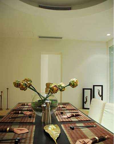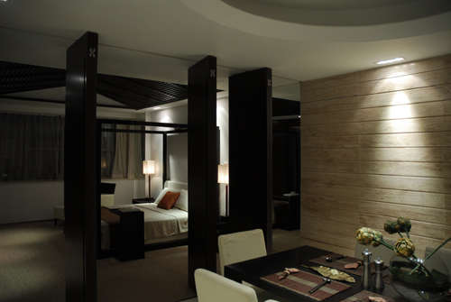 餐厅与卧室之间的隔墙处理手法亦同,全室以米白、淡黄和深浅色原木铺设,均在满足了采光采景同时,力求表现出东方的居住环境空间,加强空间的交流性。主卧室用传统的修纹实木式吊顶与木格门扇将相辉映,营造出温暖与借调奢华的私人氛围。客房则浓缩了每一处空间,特别是壁柜的设计,充满了简约而时尚的居家风格。