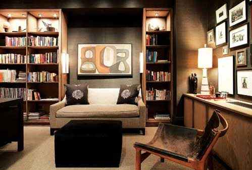 在将大部分“西村”公寓的家具出售后,沙哈重新开始装饰。比如,当起居室区域内的木制茶几落地灯,摆放在旧起居室内的一对法国1930年扶手椅之间时,看时来显得很笨拙,但这与空间内厚重的树节鸡尾酒桌却很适配。(该桌子是这对夫妇过去与朋友一起拥有的火岛避暑别墅内的一件纪念品。当房子出售时,他们中的三人抽签决定桌子的归属,希尔幸运地得到了桌子。)为了与桌子相配――其自由边是乔治中岛(George Nakashima)风格,沙哈找到一张由简斯.瑞索姆(Jens Risom)设计的沙发和保罗.克耶霍尔姆(Poul Kjærholm)设计的几把扶手椅。古式座椅的配饰还包括餐厅区的汉斯.韦格纳(Hans Wegner)设计的餐椅和办公室内选用的丹麦中世纪躺椅。在卧室空间,沙哈设计了胡桃木办公桌和床头板,空间的三面窗户使空间显得非常明亮。在这里没有窗户且并非真正的卧室空间,暗色的办公室显得有些阴郁,其原因是墙壁上饰面了粗糙的黑色布料材料。