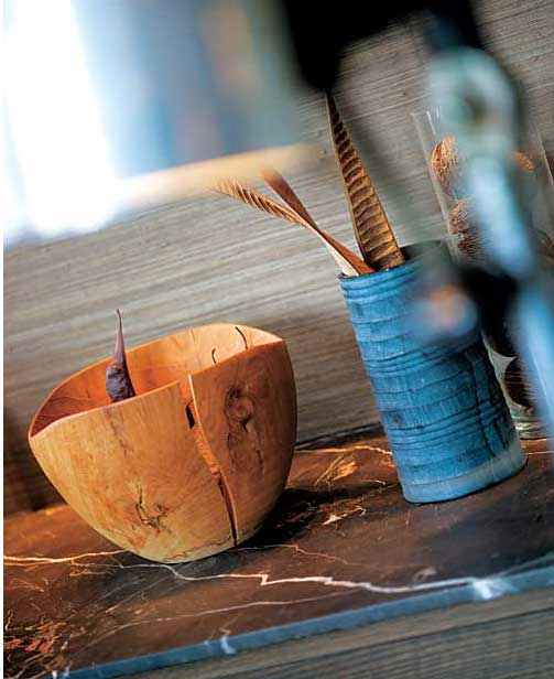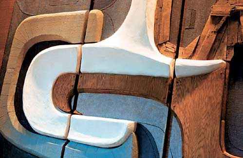 希尔创作的一幅抽象“风景”现在悬挂在办公室的沙发床上方,它原先悬挂在“西村”公寓的大理石壁炉架的上方。切尔西的起居室内没有壁炉,因此,公寓内最大程度的焦点便是一套巨大的三幅相联画,它布置在沙哈专门为此而保留的柔和照明壁龛内。15英尺宽三幅相联画是这对夫妇共同确认的产物。它是希尔在一间单独的工作室内花费了10天的时间,用树脂浅浮雕、粗麻布以及从肉类加工区街道上捡来的碎木料组合而成的。在绘制巴尼斯纽约精品店(Barneys New York)的壁画以及为伯格道夫.古德曼百货商店(Bergdorf Goodman)橱窗展示设计雕琢造型的数年经验表明,希尔能够轻松地遵循设计师的引导。然而,在他自己的家中,艺术家和设计师进行了完美的配合。