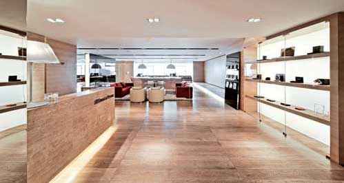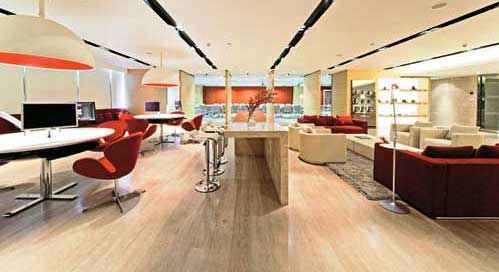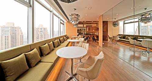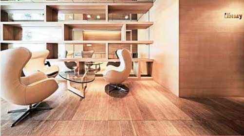 为了达到这个设计初衷,设计师在空间中从材料和色彩上进行了全面的考虑。大量运用自然材质和暖煦的光线,催化心绪沉淀;铺设质感温润的橡木地板、壁板,天花板采用简洁的线条表情,避免过度装饰造成视觉干扰;公共空间利用灰色镜墙增强场域景深,以稳重的色调与镜射的效果来深刻简练开敞的空间。设计中,局部采用红色家具及橙红色壁板、座席配搭暖色靠垫,协调出温暖且活泼的气息。同时,设计师也将图书馆的人文气息渗入本案。在公共空间,除了设置书架墙,皮革、织品、石材等质感不同的素材也被默默的耕植入其中。在舒适温暖的氛围中,提供一处交流学习与工作心得的空间。