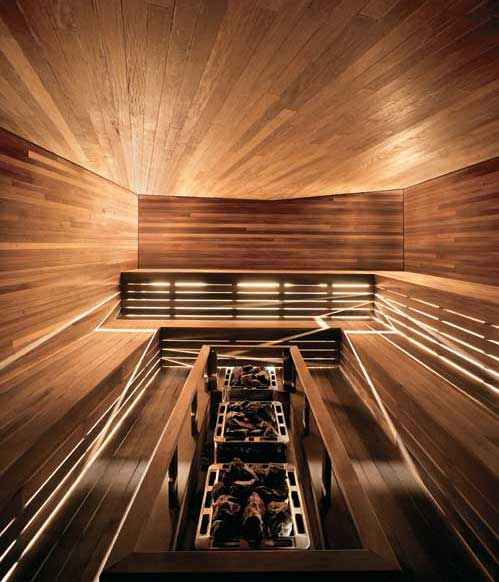 当你游览SPA馆内部的时候,首先进入眼前的就是白色菱角的冰川地形伴随着火山地貌。这两种形态仿佛这个SPA馆巨大的LOGO,提醒人们,已经进入的,是一个水与火交融的世界。谈到这样的设计思路,Gilles Saucier说到:“这样的一个商业空间,它所处的建筑曾经经历过火灾,又位于水边,设置水与火的这种交流是在好不过的创意了。冰川与火山算是自然界中水冷与热的最极端代表,将他们的形态提炼出来,在这个SPA馆的入口处加以再次呈现,这样的设计是为了让所有进入该空间的人们马上就意识到,你们进入的是一个完全不一样的世界,奇妙的旅行开始了。”如此设计上的双重性,同时也符合spa馆提供热疗体验的中心思想。这样的双重性突出表现在室内元素的形态上,水的至柔对应岩石的坚硬,在视觉上给人最大的适应范围,都说要在空间上给人舒适性,这样至刚至柔的结合,该是在舒适性上最大的包容了。当然,这样的二元空间不仅仅表现在空间形式上,于材料选择的统一上,也有着设计师巧妙的构思,木质的材料,石的材料,金属的材料,都是呼应在水元素这样的天然存在之下。金,木,水,火 ,土,这样的五行元素来自加拿大的设计师未必知晓,但是围绕水与火的主题,点缀其它材料的思路,却是有着共通之处。