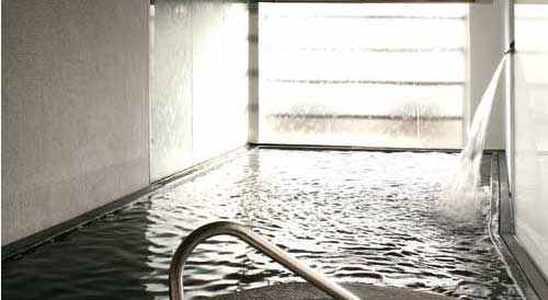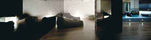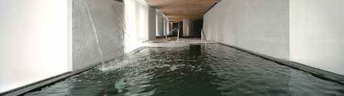 在走出更衣室的一瞬间,客人们会立刻沉浸到一个奇特的环境中。墙壁、地板以及天花板都略微倾斜,并以微不可察的不同角度,向设计者规定好的方向进行延伸。这样空间疏导的方式,是为了给所有来此的顾客一种服务的体贴感,而不是强迫,因为所有角度的设定都是来自客人习惯性能够漫步到的室内空间。这些角度,虽然不易察觉,但是为沐浴者营造出一种感觉上的不同,区别于他们已经习惯的日常环境。在这样的有形关系对比中,SPA馆的设计得以强化:每个到访者都能在最初的走进的那一刻产生一种停滞,就好像置身于一个自然的景观环境中。地面的细微起伏则创造出一种柔和的倾斜,就仿佛整个空间都会缓慢流入到低沉下去的水池中。而这样的水流在空间设计上又是一种循环的存在,利用高低不等的出水口,让顾客感受不同高度出现的水流形成的不一样的冲刷体验。一些特定的区域,比如桑拿房以及蒸气浴室,设计者故意将之处理成仿佛从地面中生长出来的姿态,它们与房间顶部连接的位置,设计师设置了起伏的木制天花板,与地面的运动形成呼应。在地面与房顶中间,利用白色大理石马赛克覆盖墙壁,这在一定程度上弱化了屋顶木材的暖色调,其结果是加重了建筑给人的暗示性。某几面特定的墙壁材料则使用了黑色板岩制,它为客人们提供了一个温暖的所在,成为热疗与冷浴中间的一个过渡所在。