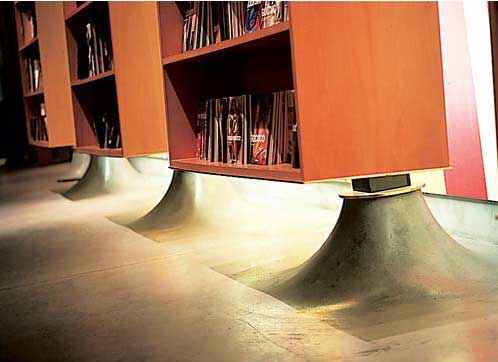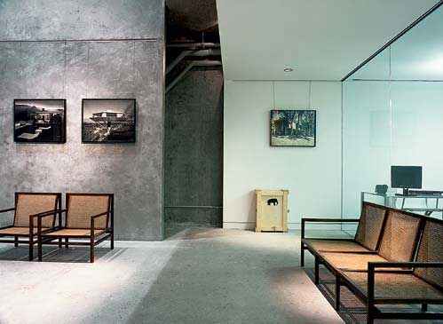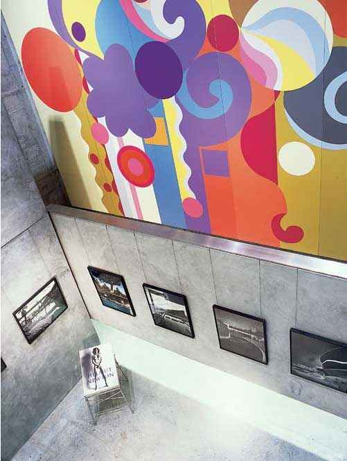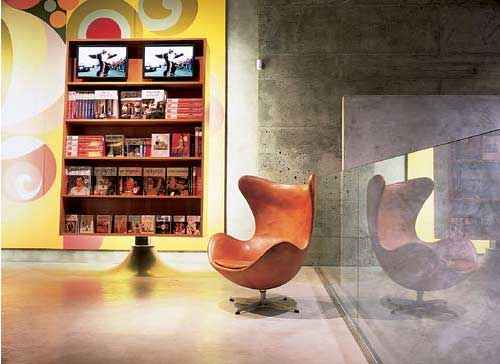 “蛋椅”摆放在书店后面由天窗照明的地方。在这里,一座混凝土楼梯向下通向一个用于定期展览的小空间,包括最近室内设计名人堂成员朱利叶斯.舒尔曼(Julius Shulman)举办的摄影展。小空间由两块20英尺高的混凝土板隔起来,它们像巨型书挡一样,其内放置有20世纪70年代帕高.拉邦纳(Paco Rabanne)设计的鸡尾酒桌和一套1958年乔奎姆.登雷洛(Joaquim Tenreiro)设计的座位、扶手椅和靠背长椅。像所有书店古老的家具一样,这些都是Taschen亲自挑选的。