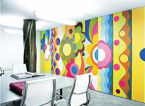 或者说力求更像艺术品。比特利兹.米拉塞斯(Beatriz Milhazes)设计的滑板图形像迷幻的风景一样装饰着室内空间。壁画印在约12英尺高的帆布上,由Benedikt Taschen亲自委托制作,他于十年前开始收藏米拉塞斯的作品。“她对鲜艳颜色、节奏和神话的南美式理解非常适合这间书店的乐观主义精神,是对Taschen价值体系的完美表达”,他说道。“多样性是生活的调味品。”作为对视觉不协调的一种平衡,天花板上的单色隔音砖网格还起到一种隔绝真正噪音的作用。