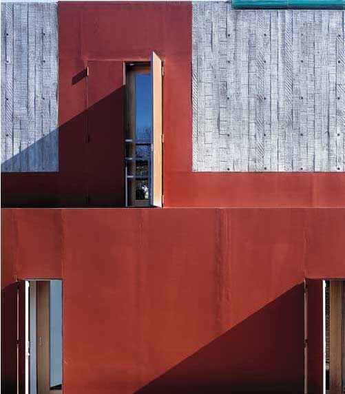 这是一栋由韩国赵秉秀(ByoungSoo Cho)设计的位于韩国Gyeonggi-do的住宅, 因建筑主体由2个盒子组成,因而建筑师命名为双盒住宅(Two-box house),整体上是清水混凝土建筑的盒状造型,由两个东西并置、南北走向的长方体单体结合而成(以下称为“东盒”、“西盒”),犹如搁置在码头的集装箱,矗立在山坡脚下。房子保留着建造初期所留下来的大面水泥墙体,远远望去,有一种粗犷的后工业气息。走近一看,混凝土墙面并不装修,建筑围板拆去后故意留下一个一个小洞,错落有致地分散于墙面上,而围板的木头纹理成了最为原始的图饰。一楼的西墙被刷上热烈的红色,一扫水泥灰所带来的沉闷,与二楼的水泥灰形成鲜明的对比。东墙上则在水泥灰墙面上间以凸出的玻璃条形橱窗,加之二楼的落地窗,透明的质感为原本平淡无奇的建筑外形增添了变化,多了几许时尚的现代感。