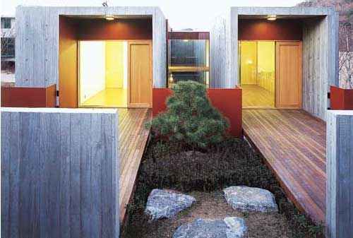 漫步其中,起承转合间不免喟叹后工业的粗犷中拥有的自然情趣,而木板和玻璃的细腻运用则点化成清水混凝土原生态中的那一抹温柔,于露台上,于中庭间,于墙角处,Two box house的盒式生活,方正而不僵硬。