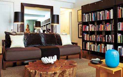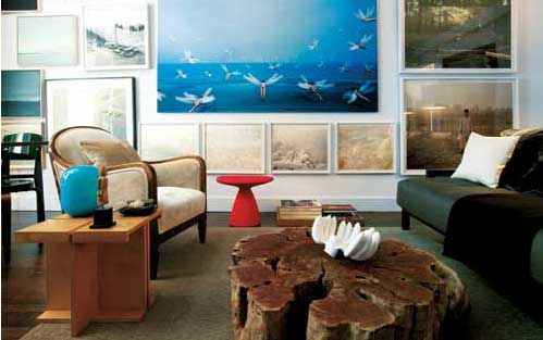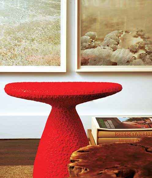 在一张用坚硬树根制成的鸡尾酒桌上,哈里.艾伦(Harry Allen)设计的一件白色树脂碗被塑造成一串串香蕉的形状,它增添了一丝奇思妙想的意味。马赛尔.旺德斯(Marcel Wanders)设计的一把闪亮的红色蘑菇形圆凳也是如此。“我主要根据本能来挑选物品”,基姆说道。同时,现成的wengé饰面的书架和与之配套的储物箱,显示出他对他所谓的“平易近人的奢侈”的职业倾向。