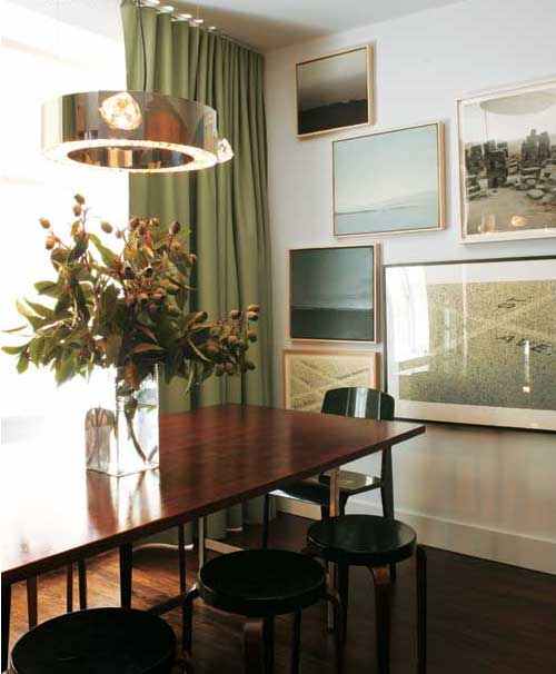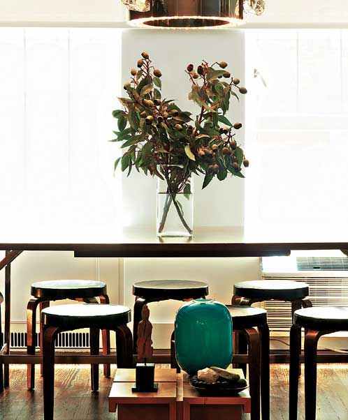 产于1950年红木桌被用来作为餐桌,其上方悬挂着一盏树枝形吊灯,它是基姆为施华洛世奇(Swarovski)的2006年“水晶宫”展览设计的,桌子的周围摆放着吉恩.普鲁维(Jean Prouvé)设计的椅子和迈克尔.托内特(Michael Thonet)设计的折叠凳。实际上,他的才华随处可见。空间内的一张定制枫木墙桌组合成为智力玩具的风格。一面枫木框架的标准尺寸镜和一把橡木坐卧两用长椅都是他担任威斯汀酒店和度假村集团(Westin Hotels & Resorts)设计总监时的原型作品,它与谢拉顿一样都是喜达屋酒店和度假村集团(Starwood Hotels & Resorts)的分公司。一张自然色的亚麻羊毛地毯是另一个喜达屋品牌Element by Westin的原型作品。
