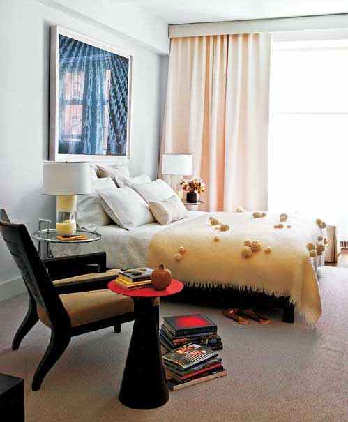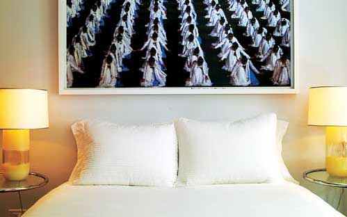 在卧室内,艾琳.格雷(Eileen Gray)设计的一对简易式玻璃墙桌、克里斯汀.利艾格雷(Christian Liaigre)设计的一把wengé饰面板条靠背扶手椅以及彼得.祖索尔(Peter Zumthor)设计的一张红色桌面脚桌与基姆为威斯汀设计的“天堂”床相得益彰。豪华的乳白色皮革遮光窗帘赋予了另一种酒店格调――一种对永恒时差感的祝福。