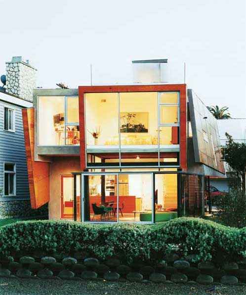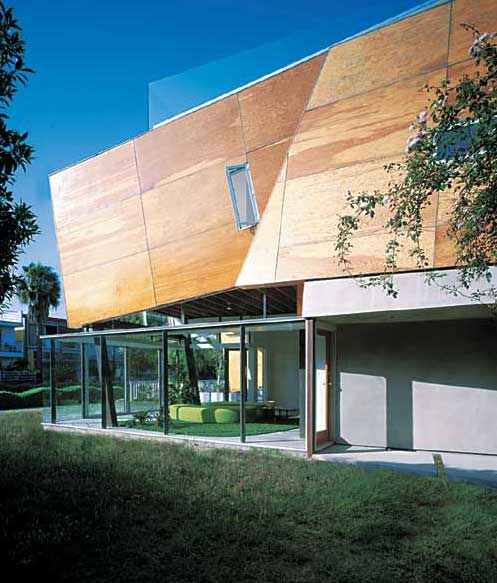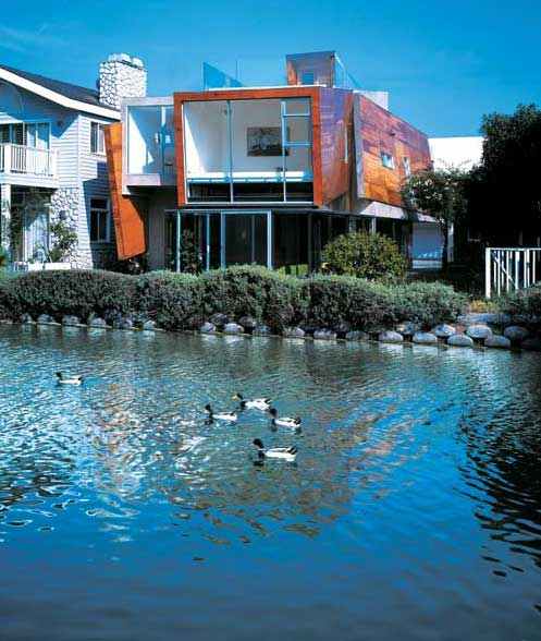 外部墙体在适应程式需要的功能要求同时滑动前进,以回应基地特征。对基础家庭空间,如卧室、浴室、厨房等的补充是设计了两个艺术空间,一个写作室和一个画室,一个小型独立的公寓组块和两个汽车库。一层的屋顶不是平面,保持着向运河倾斜俯冲的姿势,从远处看仿佛就要亲吻河流,二层是一个向前斜突的矩形几何块,从房子的后面,有直接的楼梯从一楼通到二楼的书房,可以避免女主人在这里写诗冥想的时候被打扰,两间主要卧室都向阳又面河,占据了最好的景观。