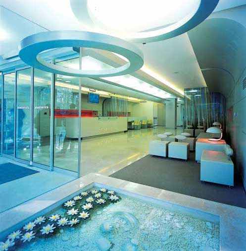 底层大厅入口处的大幅落地玻璃设计,引入半开放式这个概念。两侧的亲水莲花池,为整座建筑平添自然气息。这层多采用透明玻璃板进行空间分割,玻璃板上的竹子图案和入口处的莲花池设计交相辉映。整个空间强调线条的柔和感,吊顶和墙面的连接部分采取弧形设计,区别于平时锐度明显的直角设计。其余层面的墙壁多采用波浪形设计,地板色块也随之产生波浪形分割,讲究整体的和谐感。这些层面中半透明玻璃幕墙的运用,既保证了看诊时良好的私密性,也增加了空间的采光效果。整个医院的家具设计则倾向于简洁利落的实用主义风格,颜色多采用乳白或者嫩绿等春天色系,中间穿插玫红等明艳色彩,营造充满希望的欢快氛围。