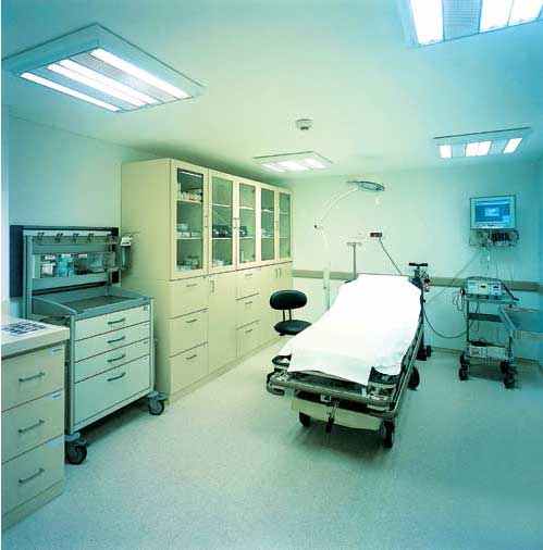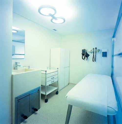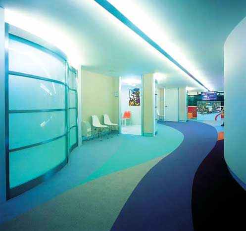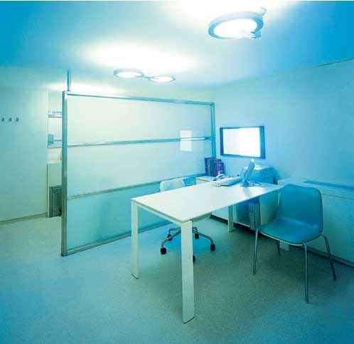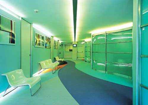 这栋8层高的建筑总面积大约2800平方米,结构精巧而又大气。地下室为救护车停靠点和急诊入口。底层为病人咨询大厅;其余楼层均为诊室和手术室。每层楼面的色调主旨各不相同,地板色彩迥异,楼层设施也随之变化并和谐地融入其中。