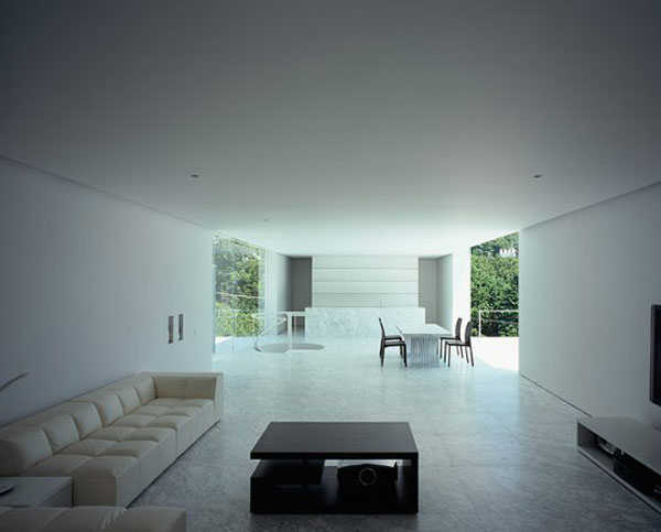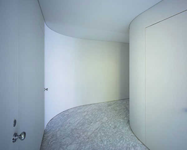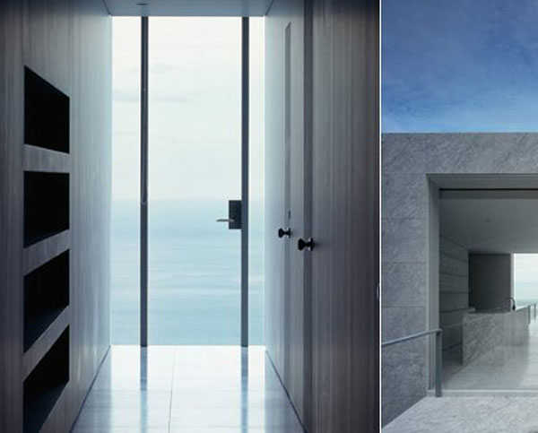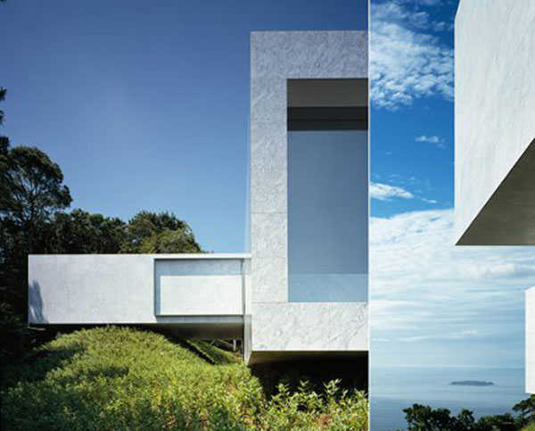 这座看上去简单的两层混凝土结构俯瞰着太平洋,在底层是几间私人房间和浴室,楼上是客厅和厨房。卧室和浴室的用水都直接从天然温泉引入。室外完全用白色水抛光大理石覆面,水平纹理向着砖块的外缘方向从粗糙质地渐变为光滑的镜面。室内也用白色大理石装饰,不但反射出南侧海洋的碧蓝,也反射出了西侧森林的青翠。