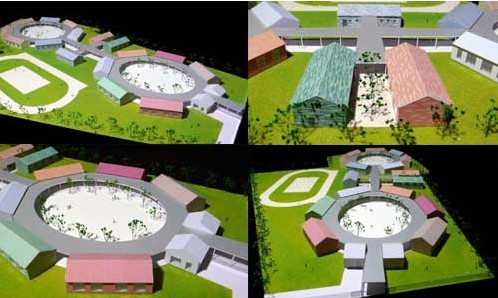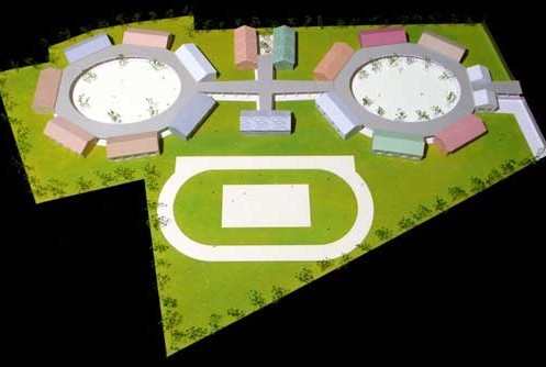 图纸右侧的圆形是普通教室部分,左侧是特殊教室部分,中间是食堂和卫生间