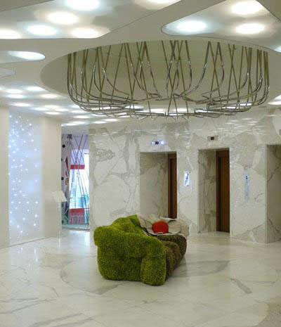 潘均形容这张绿色的沙发“像一个草坪覆在沙发上面”,极具艺术感的“草坪”胜过了常规绿植的装饰效果,成为整个大堂设计中画龙点睛的一笔。“因为大堂的颜色都比较素,空间比较矮,这个绿色的沙发会让人心情很舒畅。它的作用一是装饰,二是休息,但一般也没有人往这儿坐(笑)。所以在一个空间里,家具的选择很重要。”