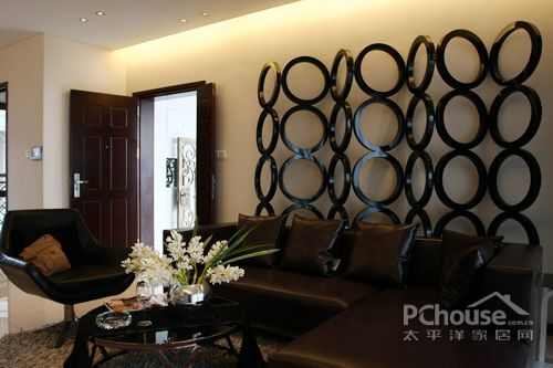 在本套案例中我们在,客厅沙发背景墙的设计上大胆采用黑色圆形突出墙面立体层次感,同时更加凸显棕色简约沙发的效果。电视背景在简单的几何线条中嵌入不锈钢条来做的造型,简约中透露出时尚感。同时配以纯白色线条式的电视柜,使黑色和棕色不在单调和低沉。简约流线美的饰品给客厅增加不少青春活力。