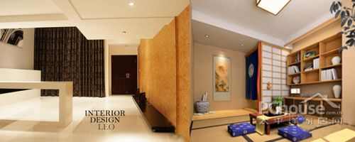 由于户型的面积不是很大,主卧从功能还必须当做客厅来使用,而业主自身希望有个榻榻米的结构可以当卧室,所以建议在客厅区域与榻榻米之间采用这样一个隔断的设计。另一个值得注意沙发最好放在房间的里侧而不是对这开门的地方这样是不雅观的。