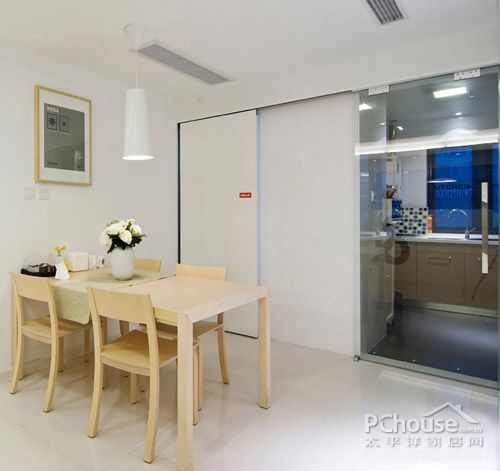 卫生间的门可以保持原来的位置,餐厅不妨使用一个小拉门的隔断将餐厅划分成厨房与餐厅的,餐桌依然使用折叠桌,拉门一边可以放置冰箱、洗衣机,微波炉、电饭煲放置在厨房区域内。这样烧菜时可以避免油烟进入房间需要空间时打开拉门收起桌子,拉门与冰箱、洗衣机位置重叠也不会感觉占用了空间。